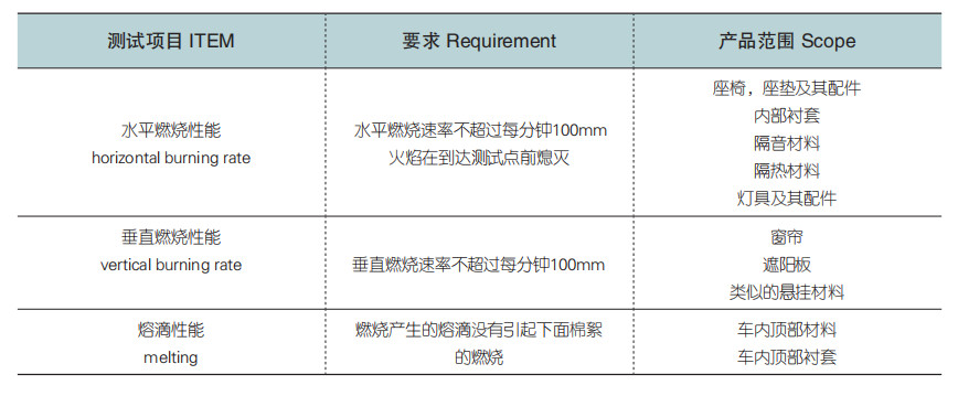 2.目前國家對汽車內飾材料的標準只有GB8410-2006,該標準對部分內飾材料缺乏對真實試驗的模擬。而除了汽車,客車、校車等大型車輛對內飾材料燃燒的條款也是引用自GB8410-2006。長途客車大量配備窗簾懸掛物,按汽車燃燒標準來對其評價是缺乏參考意義的。目前客車內飾材料的燃燒特性標準正在起草討論中。希望此標準實施能完善目前標準的弊端。如果需要對材料進行全真實的評價體系,除去阻燃性,還有霧化性能、車內VOC測試,材料常規性能測試全面進行評價。
